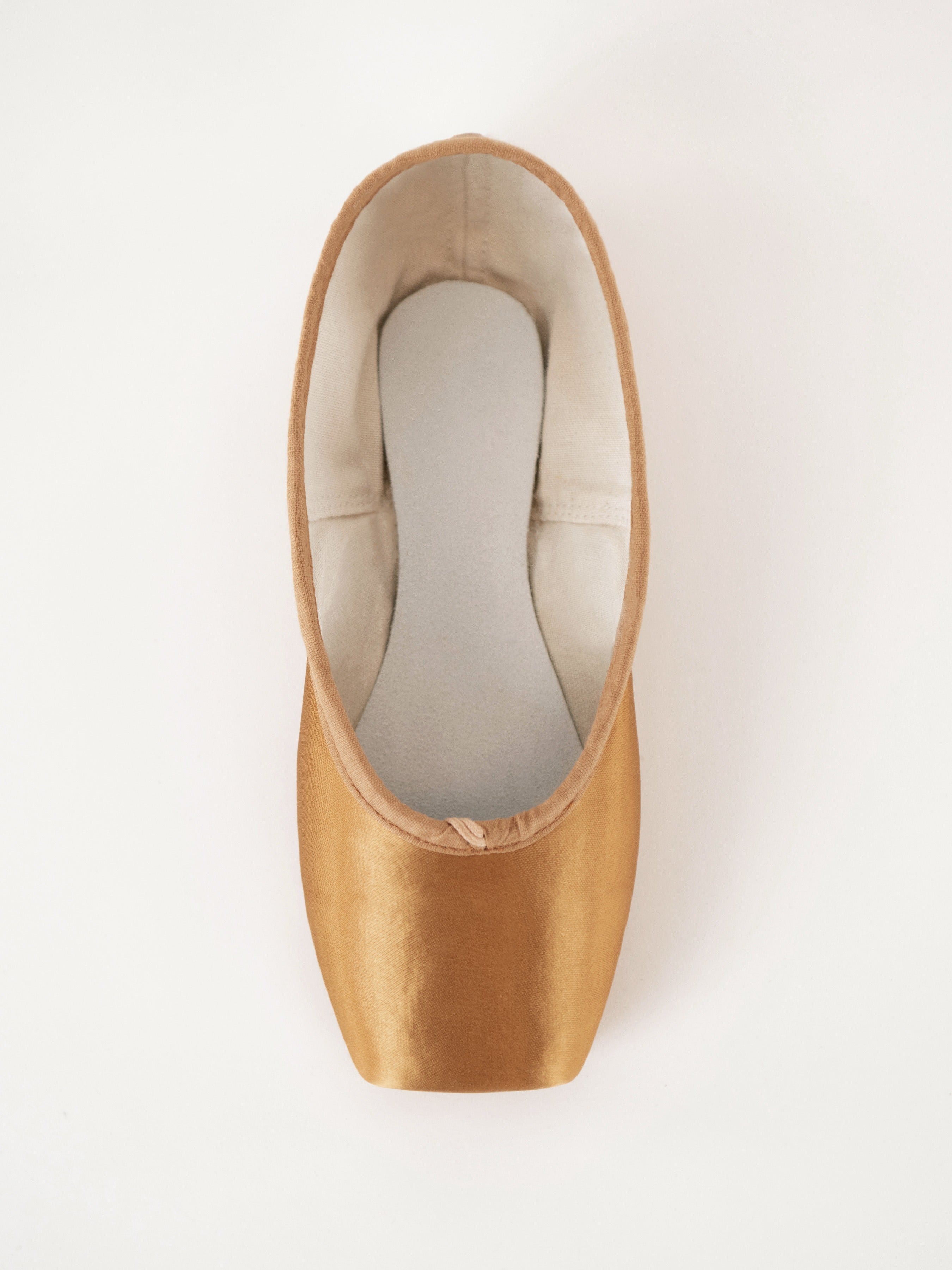 Pointe shoes in the Premiere Collection are our most substantial and have the most paste. The toe box is our strongest and most stable, with extra support that extends all the way around the box through the back of the foot.