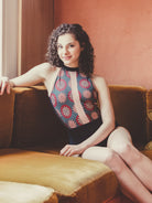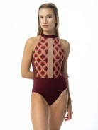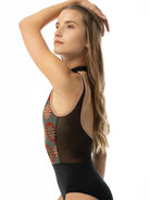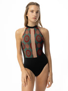 Printed mock turtleneck leotard with mesh details and open back.