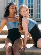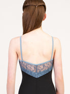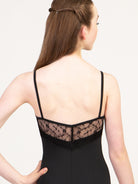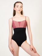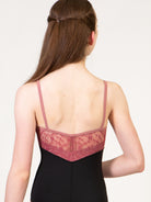 Empire camisole leotard with lace V inset, princess seams, and low pinch back.