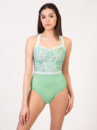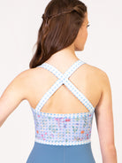Pinch front thick strap camisole leotard with printed mesh overlay. Available in Blue and Kiwi Green.
