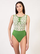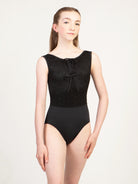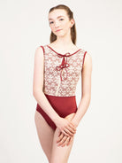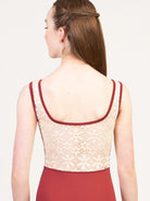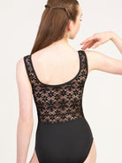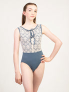 Scoop front tank leotard with lace overlay, faux tie closure, and lace back. The Flower Power Collection is made for the free-spirited dancer. It features a large scale, boho floral lace, 70s inspired leotard designs, and the perfect rich, fall color palette. Available in solid Black, or for a truly vintage feel, go for Copper, Green, or Slate paired with our custom straw colored lace.