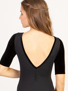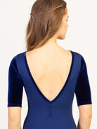 Velvet empire bateau neck half sleeve leotard with princess seams and low pinch back. The Jewelry Box Collection serves holiday glam and features refined silhouettes and feminine tailoring. Each style is made with luxurious velvet fabric in the 'it' colors of the season- classic Black, festive Garnet, and deep Sapphire.