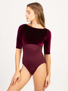 Velvet empire bateau neck half sleeve leotard with princess seams and low pinch back. The Jewelry Box Collection serves holiday glam and features refined silhouettes and feminine tailoring. Each style is made with luxurious velvet fabric in the 'it' colors of the season- classic Black, festive Garnet, and deep Sapphire.