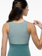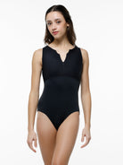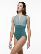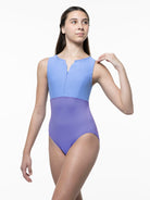 Empire zip front leotard with princess seams and racerback.