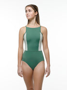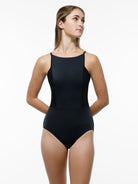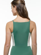 Square bateau neck camisole leotard with princess seams and ribbed accents.