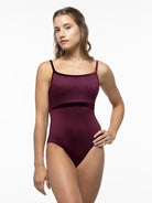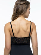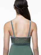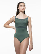 Lace empire camisole leotard with velvet accents.