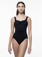 Empire tank leotard with pinch front and princess seams.