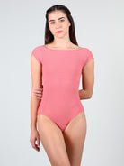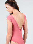 Ribbed empire cap sleeve leotard with princess seams and low pinch back.